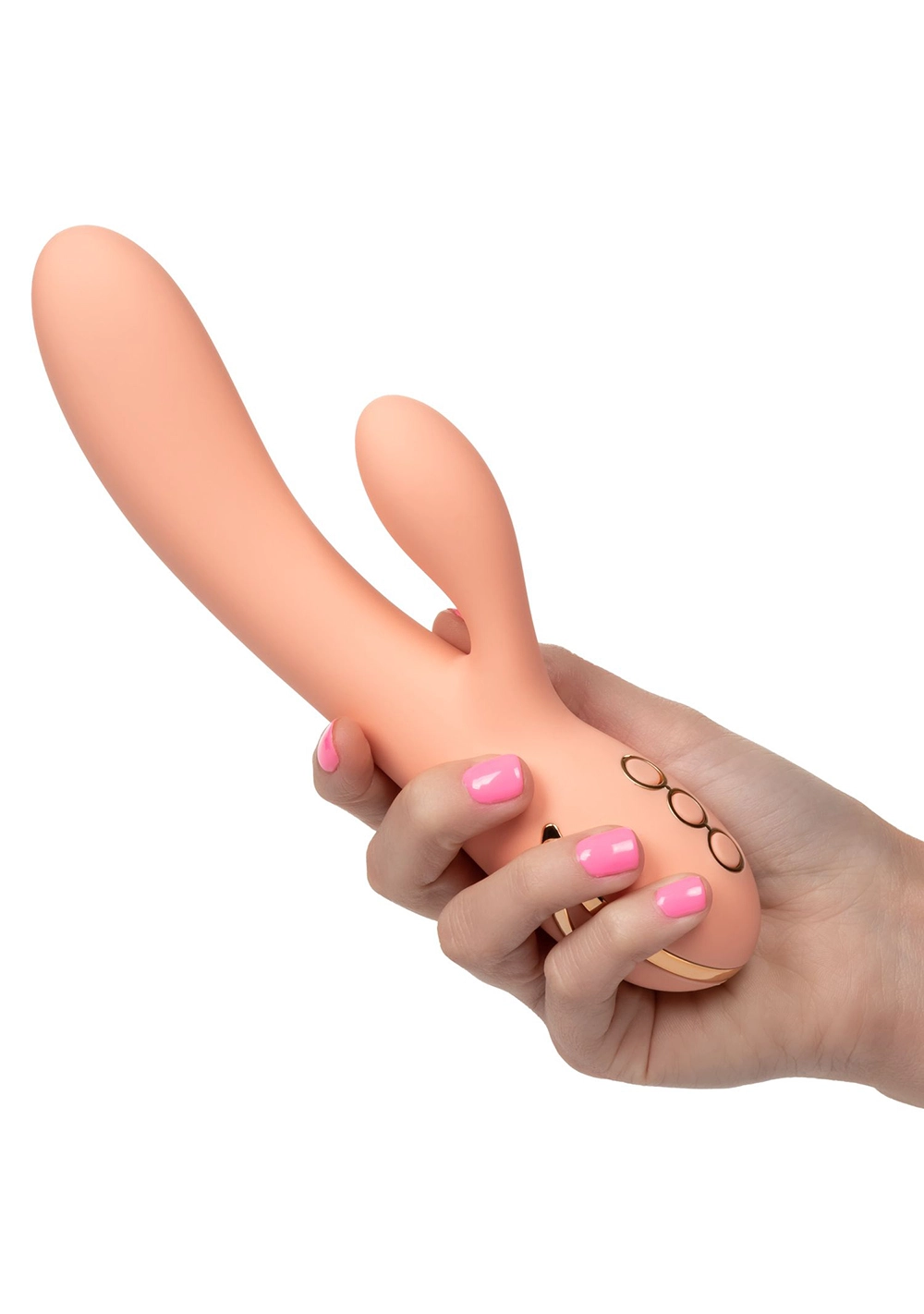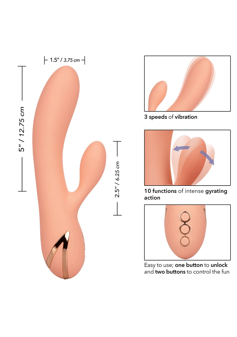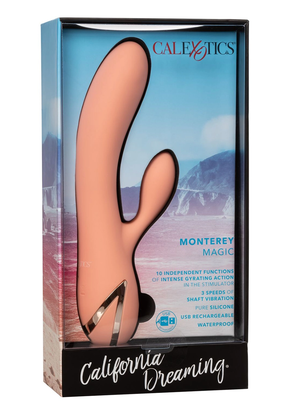 Monterey Magic offers 10-functions of gyrating motion in the stimulator with 3 speeds of independent shaft vibration allowing you to experience pleasure sensations with just two little buttons (one controlling the stimulator, the other for the shaft). A third button controls the power, with an included three-second-press travel lock.