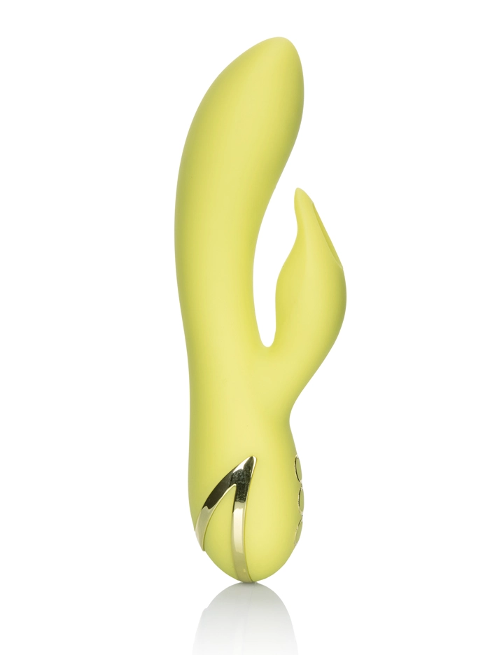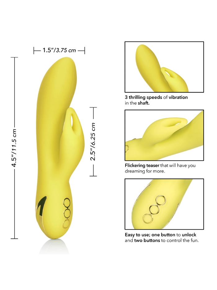 Dream of sexy fun under a golden sun with a new kind of twice-as-nice vibrator. This powerful waterproof toy has a uniquely-shaped clitoral stimulator – rather than bunny ears or a tongue shape, it’s round, meant to encase the clitoris and offer stimulation around it, rather than on. The shaft is equipped for three levels of vibrations independent of the external stimulator, which lets you explore ten more functions of vibration, escalation and pulsation. Once you find your favorite setting there’s no need to scroll through all ten next time you turn Venice Vixen on–its memory chip resumes the last function you were using. Take it anywhere with confidence thanks to its travel lock: an