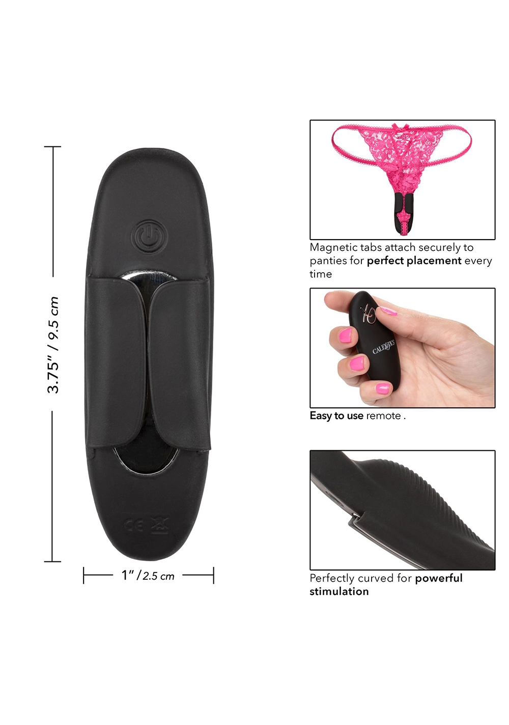 Discreetly designed to nestle quietly where it counts, and featuring a long-range remote control. The stimulator is perfectly sized for use in any panty. With ultra strong magnetic tabs that fold into place.
