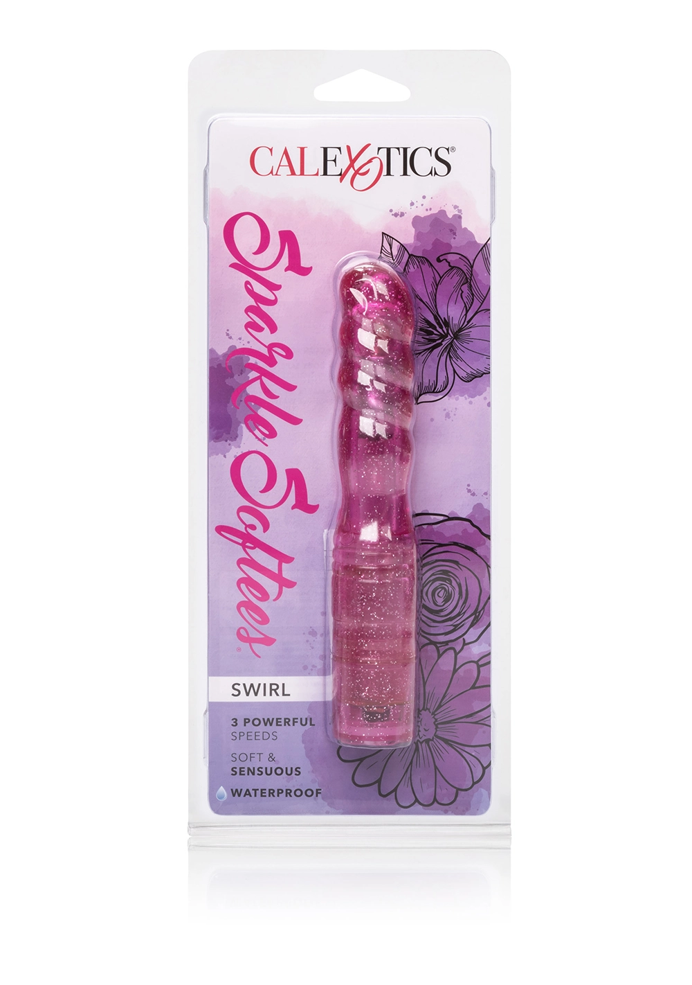 Sensually swirled for your heightened pleasure, the exotic Sparkle Softees stimulator is super soft and power-packed. The superior quality, multi-speed personal massager is waterproof for fun in or out of the water. The ultra-soft and smooth vibe is made from hygienically superior unscented, TPR and has a durable ABS end cap, and sparkling glittery finish.