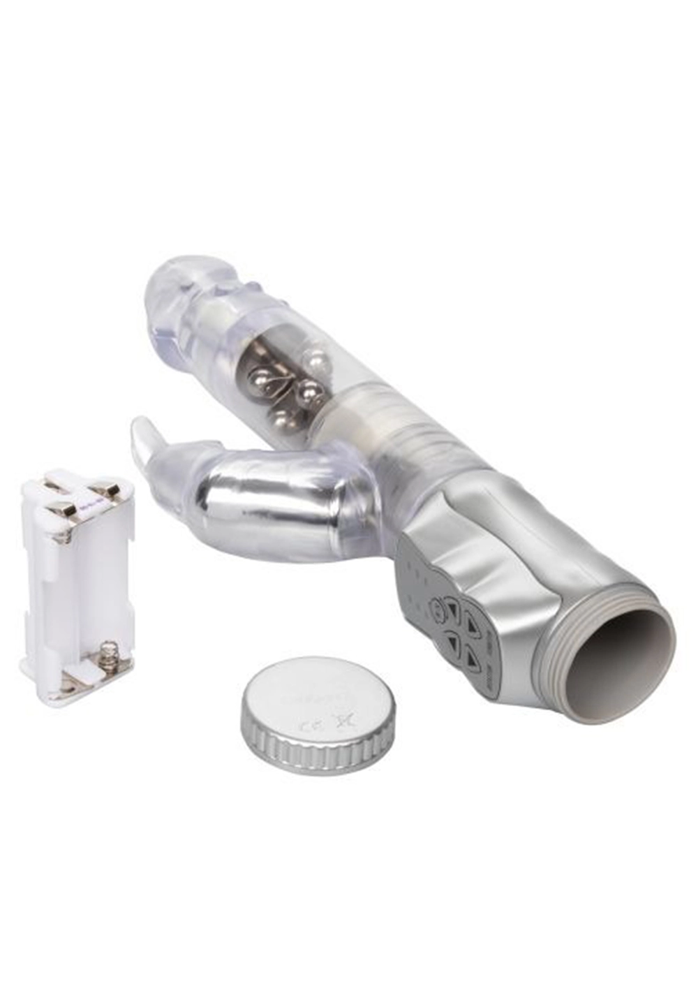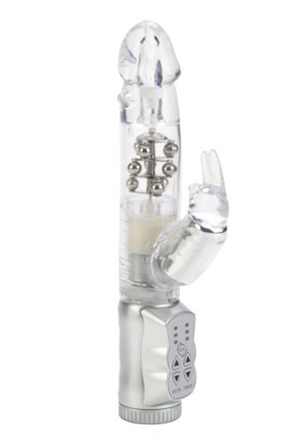 The Waterproof Jack Rabbit is the perfect companion for intensely pleasurable intimate fun. The multi-speed, reversible rotation vibe is ideal for experienced explorers and daring first-time users looking for a memorable orgasmic experience. Made from smooth, pliable phthalate-free PVC, the discreet massager measures 4.75″ (insertable) x 1.5″. The vibe has a transparent jelly shaft, with floating metal beads rotation, and a super-soft, curvy bunny-shaped clitoral teaser, with flickering ears for intense stimulation. To maximize pleasure, the easy-to-use massager boasts 3 vibration speeds and 3 speeds of reversible shaft rotation. To intensify the sensations, it is recommended that you use a quality lube. The popular rabbit style makes solo time in the bath or shower much more fun! Runs on 3 AA batteries and has an EZ load battery case. Always remember to clean the vibe before and after use. Spray with a toy cleaner spray or wash in warm, soapy water.