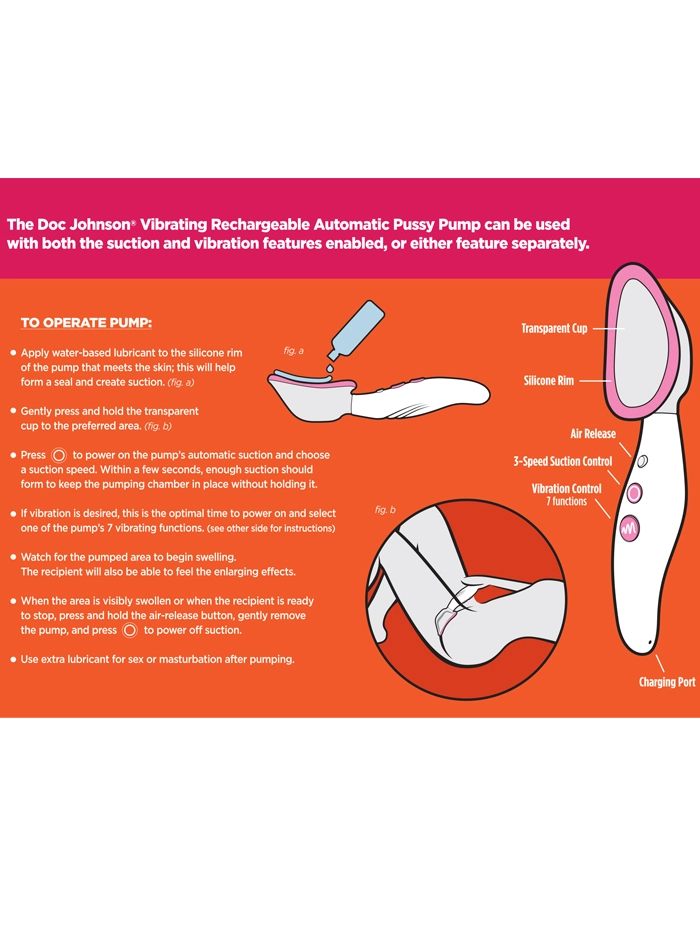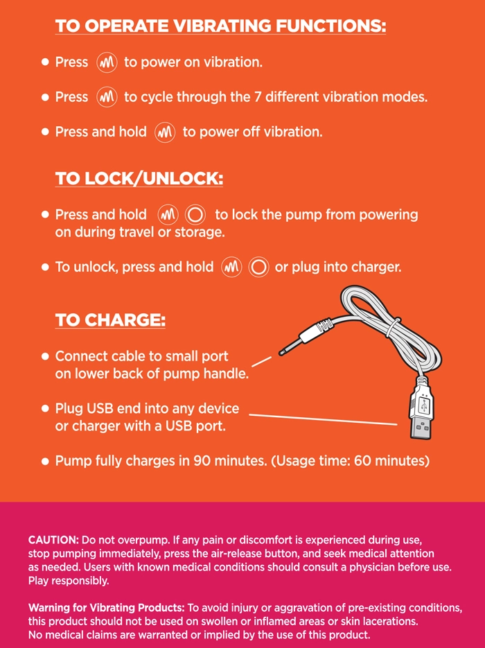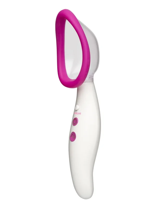 Explore heightened sensitivity and sensation with this rechargeable vulva pump featuring individually-controlled suction and vibration: enjoy either sensation, or both at once! The pump is equipped with 7 vibration functions and 3 pumping speeds, and you can use it hands-free; a few seconds after the automatic suction is turned on, the pump should be able to stay in place without being held. Watch as suction pulls the vulva into the transparent cup—the swelling is a normal effect. Featuring an air release button for fast, safe removal; a smooth, velvet-touch handle; and power control locks for storage and travel.