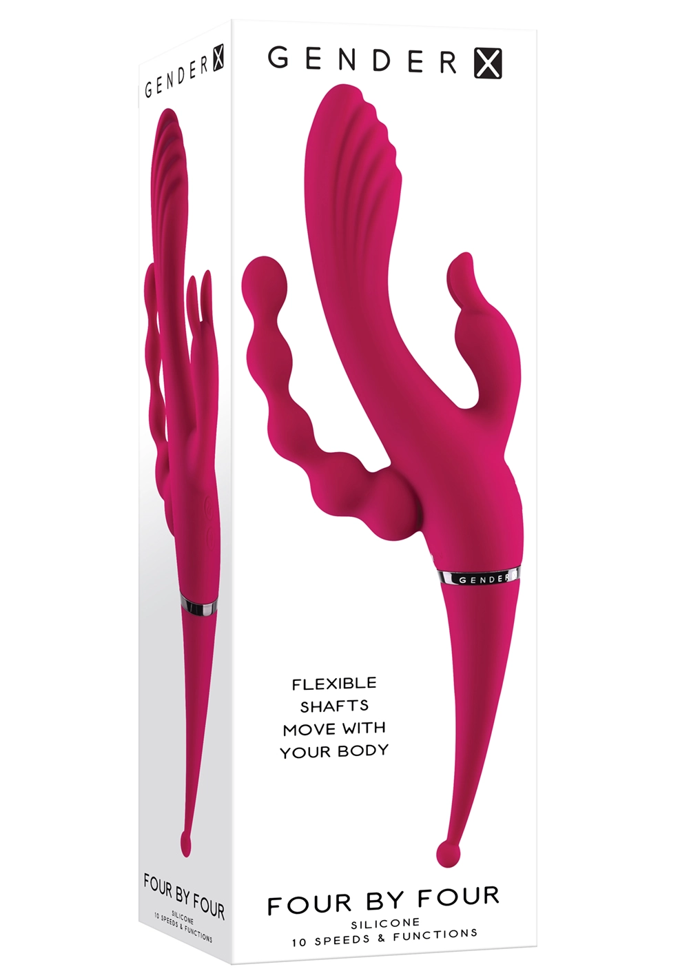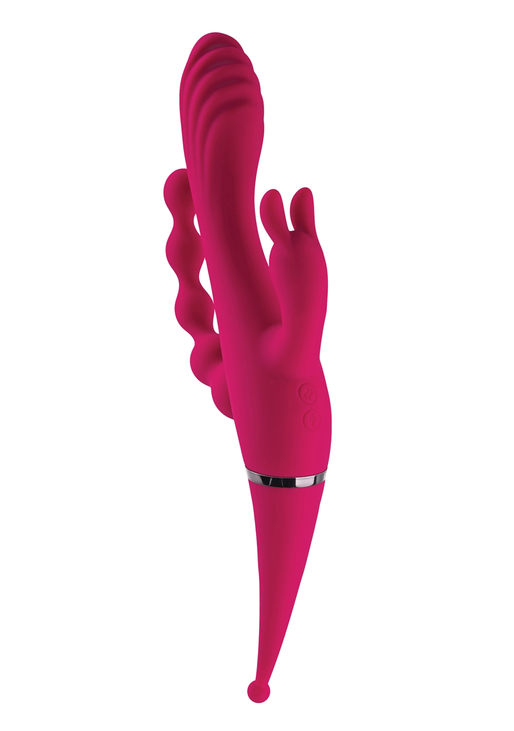 This remarkable vibrator has four points of stimulation in just under 10 inches! The center shaft features two playable ends – a gently curved side with a bulbous textured tip, and a thin, pointy round ball end for targeted stimulation. Emerging from either side are two more stimulators – a hard-working rabbit with buzzing ears and a chunky head, and a thin, curved beaded shaft that flexes easily to move with your body. A 2-button control panel engages 3 motors at once, with a separate button for the round-tip pointer. Find out what fantasies this quadruple-stimulation toy can bring to life with its abundant possibilities! Completely rechargeable, water submersible and easy to clean.