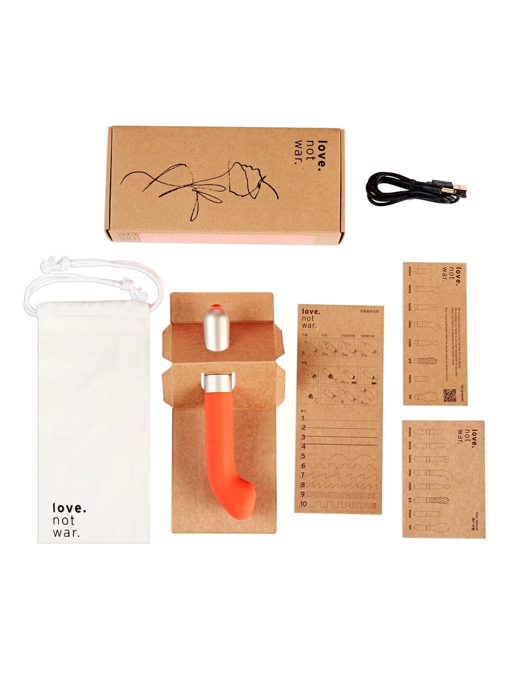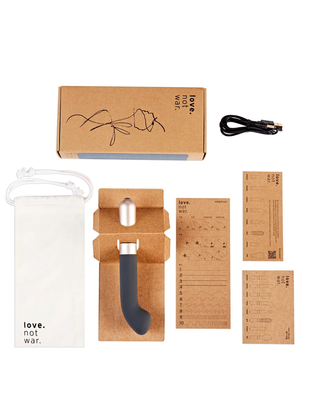 Love Not War is a new innovative line of sustainable and eco-friendly vibrators—the base of the vibe is made from recycled aluminum, which is one of the most sustainable metals (98% recycled worldwide.) The main part of the toy is made from silicone, which is more readily recyclable than plastic and plastic-derived materials. Even the storage bag that comes with the vibe is made from sustainable bamboo fabric. Love Not War vibes use very small amounts of plastic, and the company recycles that plastic within the factory.