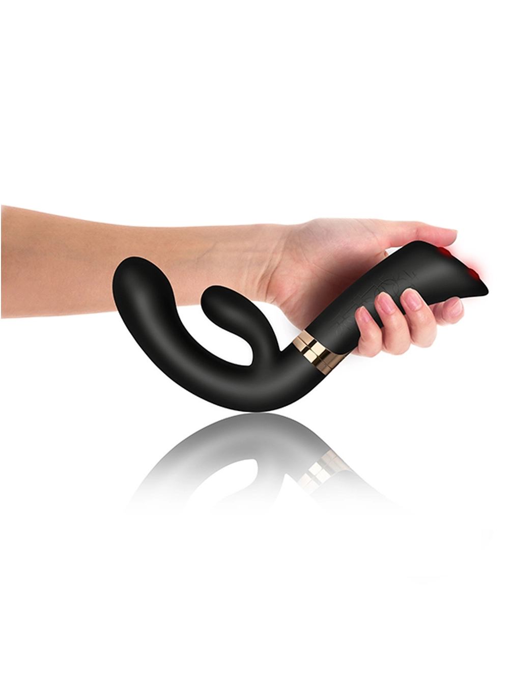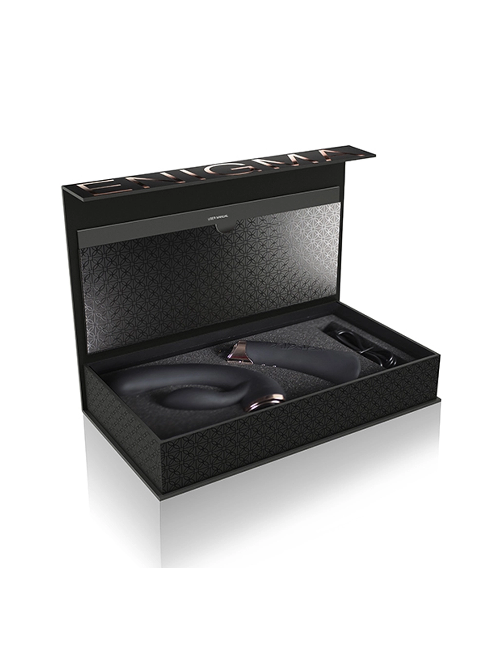 The Rocks-Off Fuzion Enigma offers a velvety silicone exterior and extended-reach design that lets you easily maneuver for simultaneous internal and external stimulation. There’s no wrong way to use it–choose whatever works best for you! Balanced to sit comfortably in your hand, the unique ergonomic design and single button controls let you focus your experience to how you like it. The curved handle and flexible shaft allow for precision pressure–stimulate the G-spot with just a gentle downwards motion. Two dual independent motors work in tandem to offer a truly blended pleasure experience, with ten powerful vibration and pulsation modes (three power levels and seven vibration variants). Designed by experienced industry vets, Enigma is meticulously created to work for a wide variety of body types. The extended handle makes this vibe an excellent couple’s toy, too–let your partner take control as they maneuver the Enigma towards all your sweetest spots. USB rechargeable; the base unlocks for discreet charging. Simply unlock the detachable handle from the stimulators and store them away until later use. A three-hour charge powers up the toy for three hours of play. When in the locked position, Enigma is fully waterproof. The only mystery surrounding this vibe is uncovering all the sensual ways you can use it!